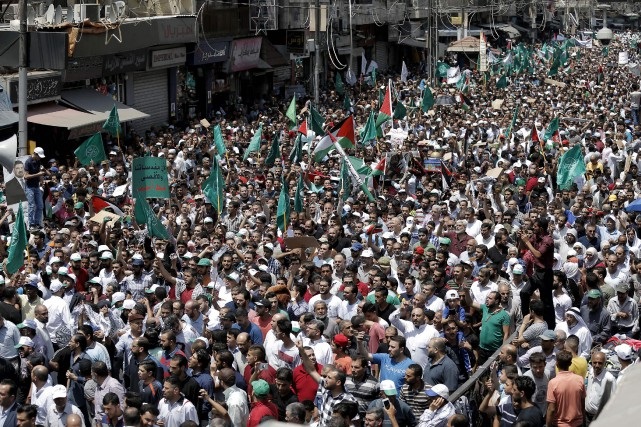 Miles de jordanos reunidos el viernes ante la embajada de la entidad sionista en Ammán reclamaron el fin del acuerdo de paz con Israel en señal de protesta contra la muerte de dos jordanos a manos de un agente de seguridad de la embajada israelí el domingo y las continuas agresiones israelíes contra la Mezquita de Al Aqsa.