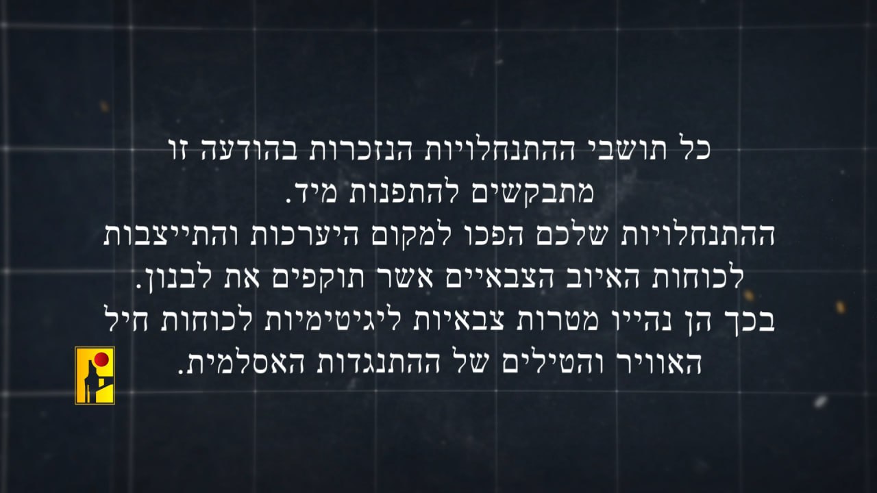 “Sus asentamientos se han convertido en bases de operaciones para las fuerzas militares enemigas que atacan el Líbano. Como resultado, se han convertido en objetivos militares legítimos para las fuerzas aéreas y de misiles de la Resistencia Islámica”.