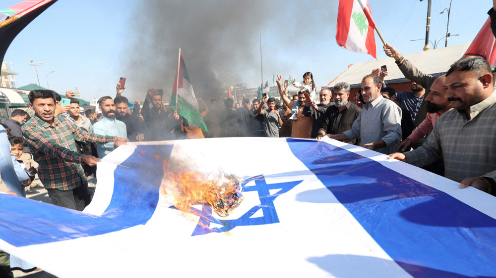 Manifestantes iraquíes quemaron banderas de EEUU, el Reino Unido e “Israel” durante manifestaciones masivas después de las oraciones del viernes para denunciar la continua agresión israelí contra Gaza y el Líbano.