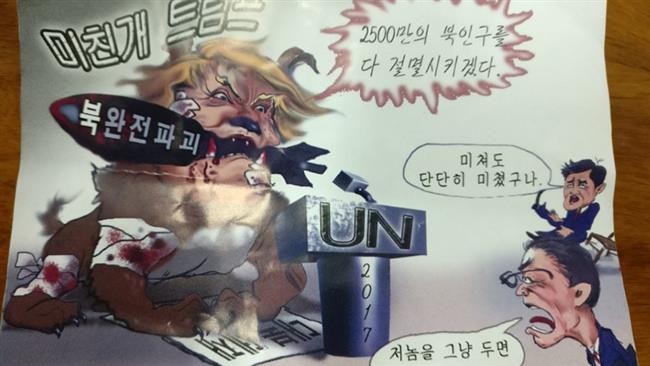 En los coloridos folletos que se encontraron en toda la capital surcoreana, Trump puede verse representado como un perro con rasgos humanos detrás de un podio con el título de “ONU 2017” y con una bomba en la boca, en la que está inscrito el título “Destruiré totalmente Corea del Norte”.