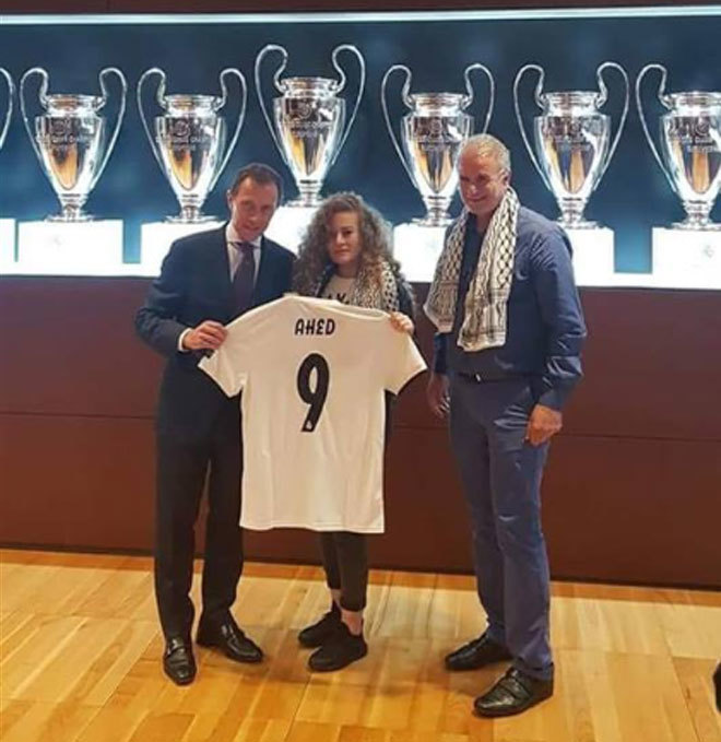 La imagen, que inmortalizó la llegada del ícono de la causa palestina al estadio del famoso club de fútbol Real Madrid, fue retransmitida masivamente en las redes sociales. Ella muestra a la adolescente acompañada de su padre recibiendo de las manos de Emilio Butragueño, director de relaciones institucionales del Real Madrid, una camiseta del club merengue con su nombre.
