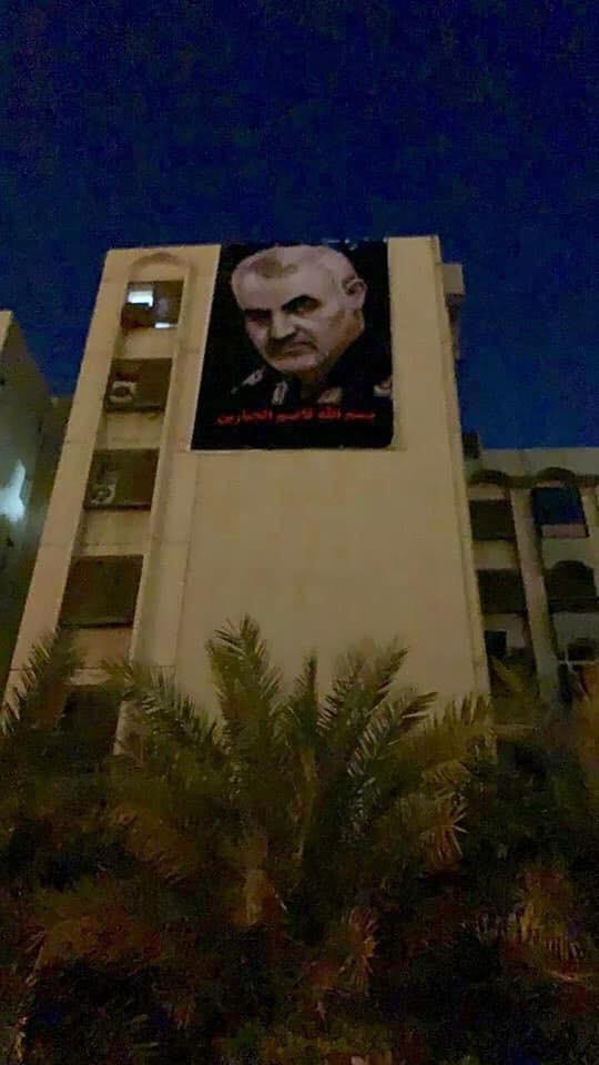 Grandes carteles en honor a los comandantes mártires Qassem Suleimani y Abu Mahdi Al Muhandis fueron colocados en dos edificios frente a la embajada de EEUU en Bagdad.