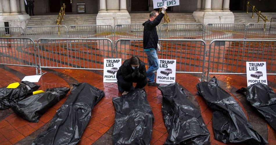 Manifestantes estadounidenses frustrados con el manejo del presidente Donald Trump de la pandemia de coronavirus han colocado bolsas con cadáveres simulados fuera del Trump International Hotel en Washington DC.