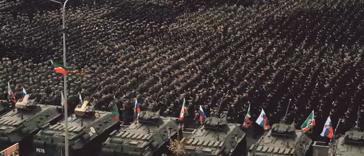 Vestido con un uniforme militar, con charreteras nuevas de coronel general otorgadas recientemente por el presidente ruso, Ramzan Kadirov pronuncia un discurso allí frente a decenas de miles de combatientes bien equipados y armados.