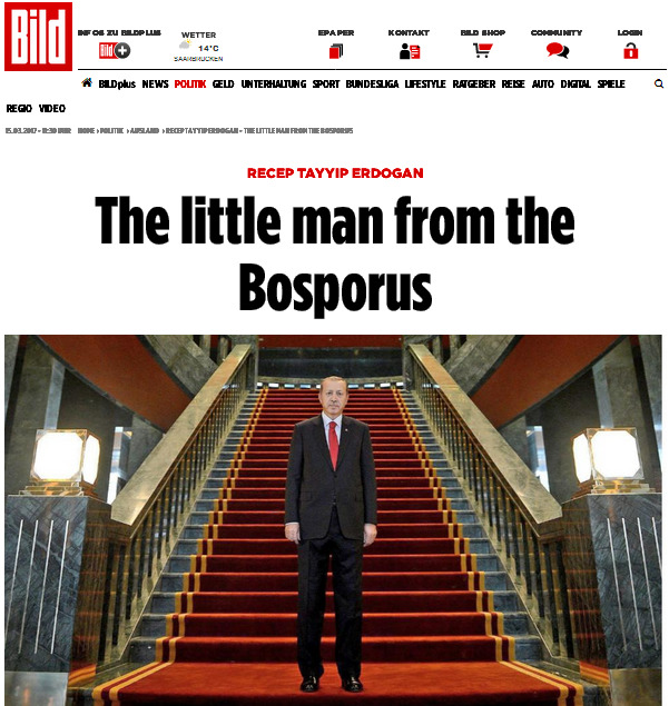 Estos titulares fueron acompañados de un artículo titulado “El hombrecito del Bósforo”. Esto se produce en un momento en el que Ankara está enfrascada en una agria disputa con varias naciones europeas, incluida Alemania, por los planes de los ministros turcos de celebrar mítines políticos en el extranjero.