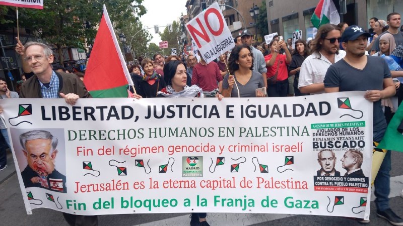 Miles de manifestantes (entre 10.000 y 20.000 según los organizadores) llenaron este domingo la ruta que conecta la Calle de Atocha con la Puerta del Sol, en el centro de Madrid. Miles de personas de todas las edades y procedencias participaron en la marcha por Palestina y condenaron el genocidio israelí en la Franja de Gaza. Varios partidos políticos y organizaciones sociales apoyaron la convocatoria de la marcha.