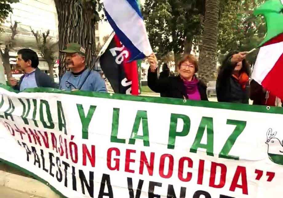 Los chilenos congregados en la Plaza de la Victoria también reclamaron el fin de los criminales ataques de Israel contra la indefensa población civil palestina en la Franja de Gaza, donde la devastación es de enormes proporciones.
